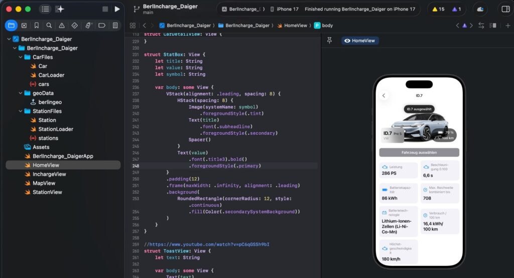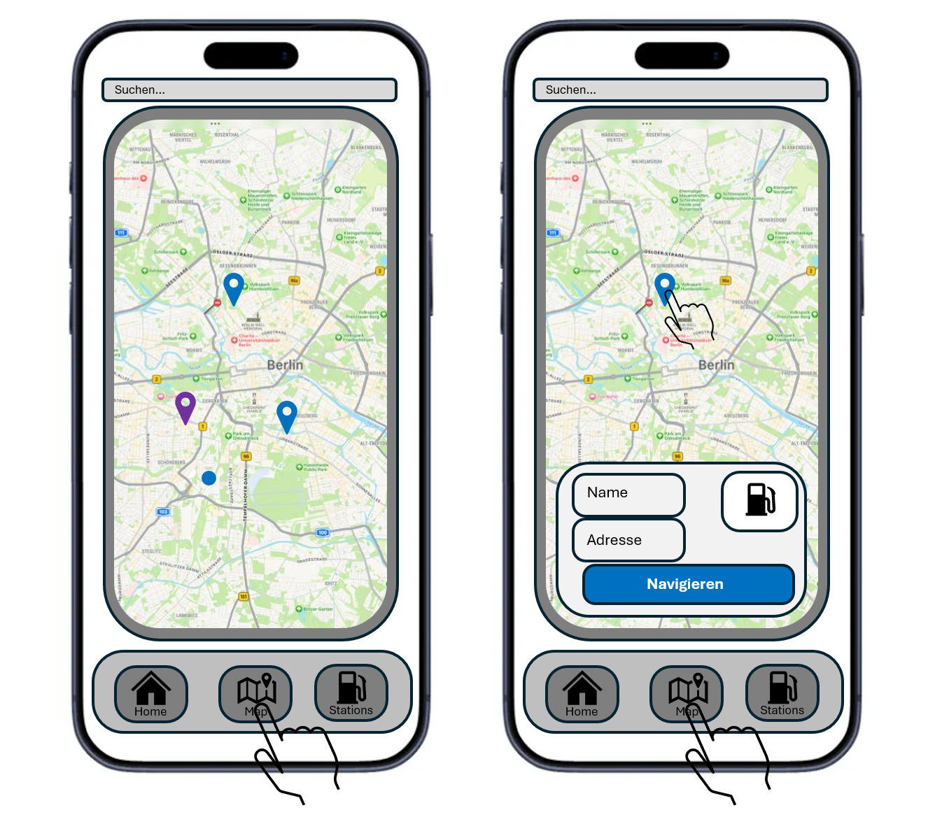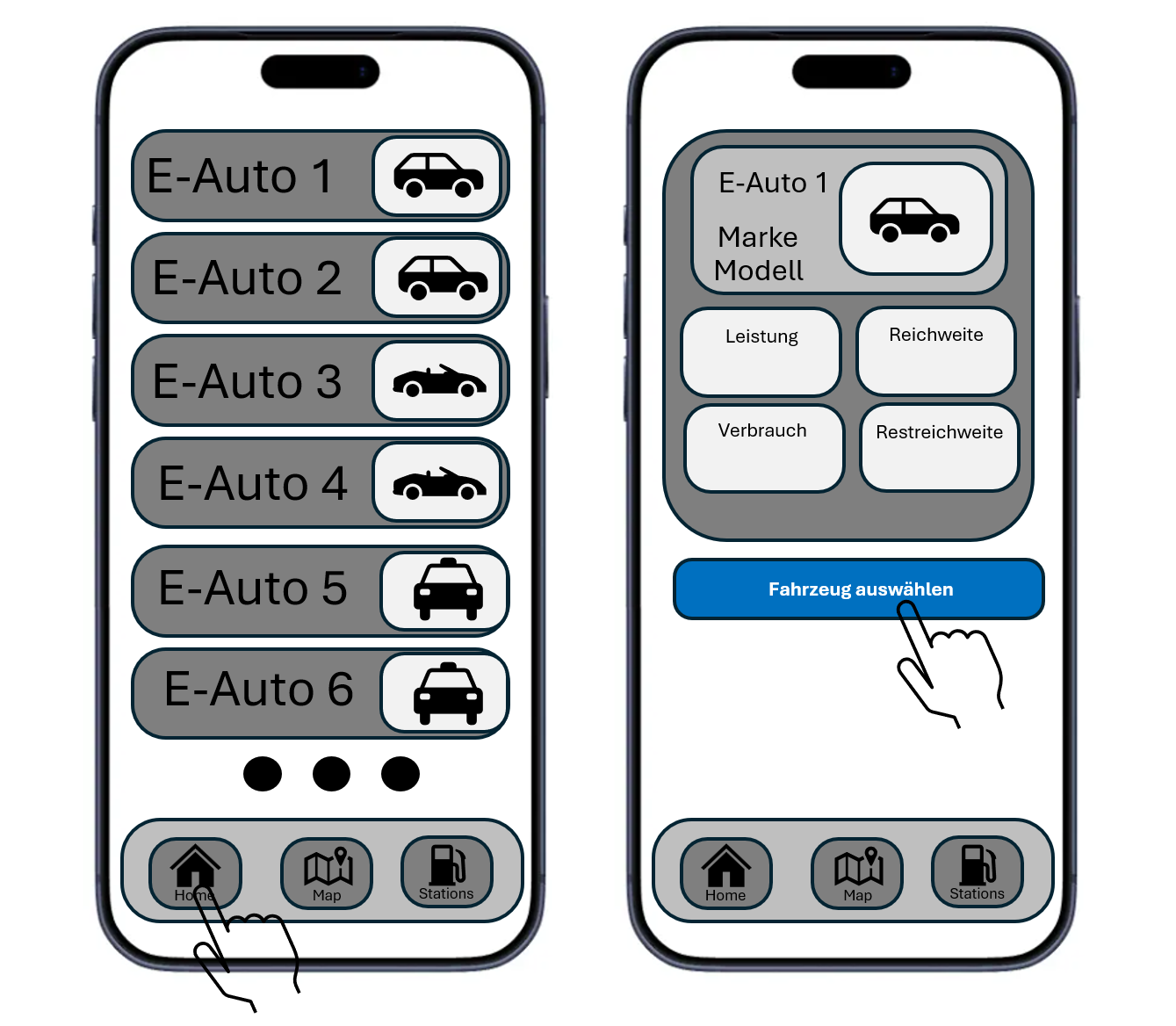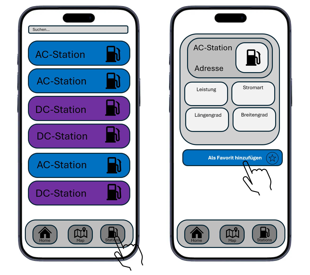 Die App ermöglicht es, auf einen Ladepunkt auf der Karte zu klicken und alle relevanten Informationen wie Ladeleistung, Steckertyp, Preis und Verfügbarkeit einzusehen sowie diesen Ladepunkt als Favoriten zu speichern. Als weiteres Feature wird eine Simulation integriert: Dabei können verschiedene Fahrzeugprofile mit unterschiedlicher Batteriekapazität und Motorleistung ausgewählt werden. Die Karte zeigt die Distanz und die geschätzte Fahrzeit für die Route an. Darüber hinaus wird berechnet, ob die Strecke mit dem gewählten Profil möglich ist, wie lange voraussichtlich geladen werden muss, um eine optimale Route zu gewährleisten, und welcher geschätzte Ladezustand am Ende der Route verbleibt.