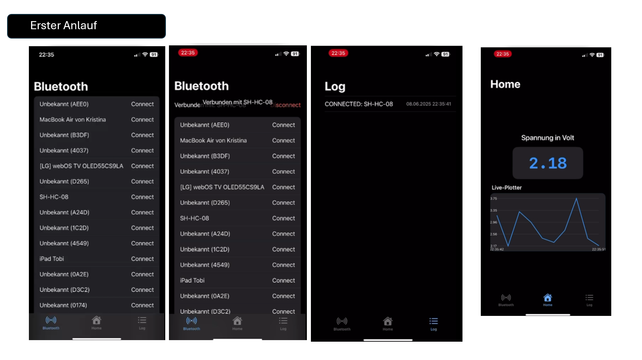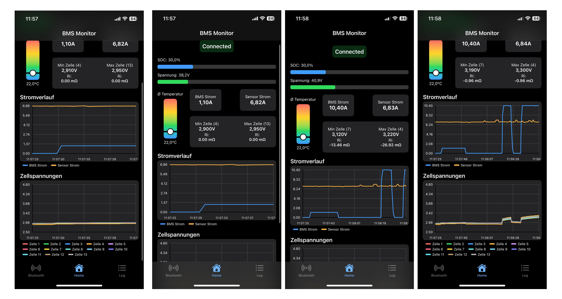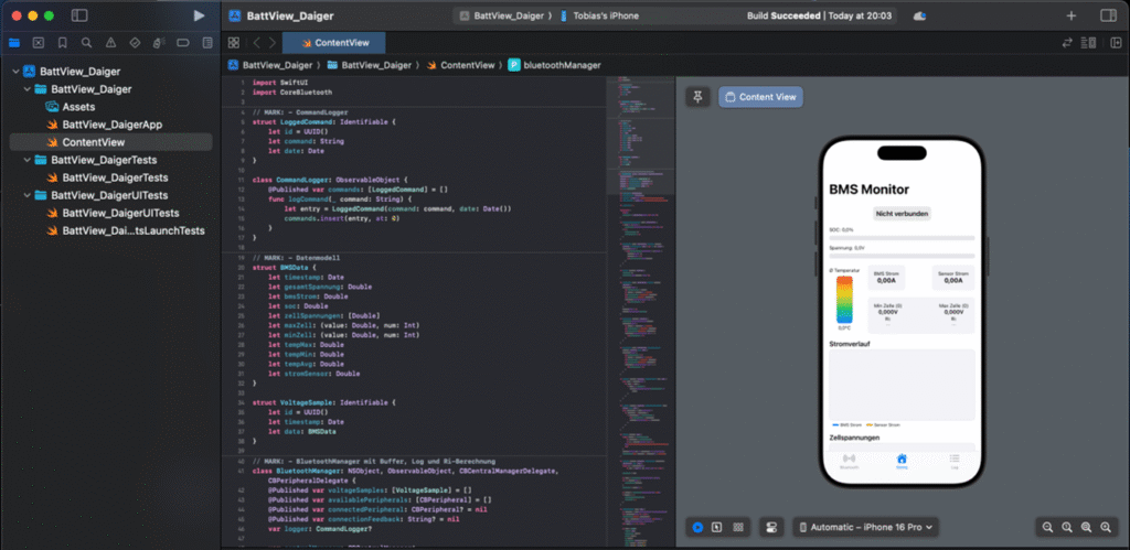 Entwicklung einer iOS-App, das die Daten eines Batterie-Management-Systems von DALY mit einem ESP32 ausliest und diese live über das BLE Modul SH HC-08 an meine App überträgt. Die App zeigt die wichtigsten Batterieparameter (Zellspannungen, Temperaturen, SOC) an und plottet diese in Echtzeit. Ferner werden die Innenwiderstände der stärksten und schwächsten Zelle berechnet als Vergleich.